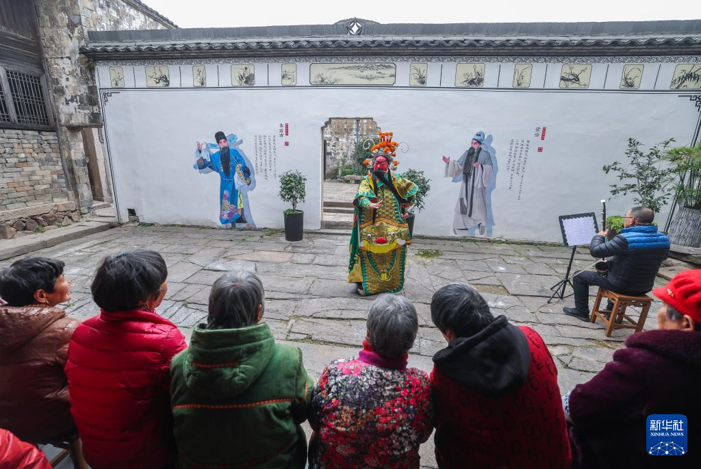 12月25日,郑店村婺剧坐唱班的演员在村文化礼堂为村民们演出婺剧《杨八姐游春》。