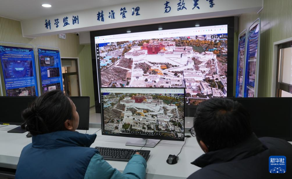 12月4日,布达拉宫监测中心的工作人员在查看无人机拍摄的图像。