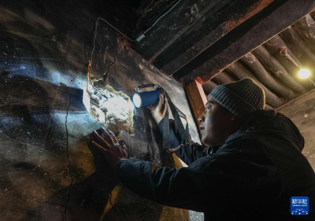 12月4日,布达拉宫监测中心的工作人员旦增旺堆巡查布达拉宫地垄传感器设备。