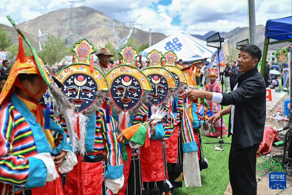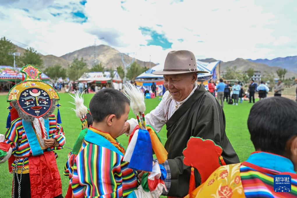 7月16日,76岁的湘巴藏戏国家级非遗传承人次仁多吉(右二)在南木林县非遗公园内给即将表演湘巴藏戏的小演员整理服装。