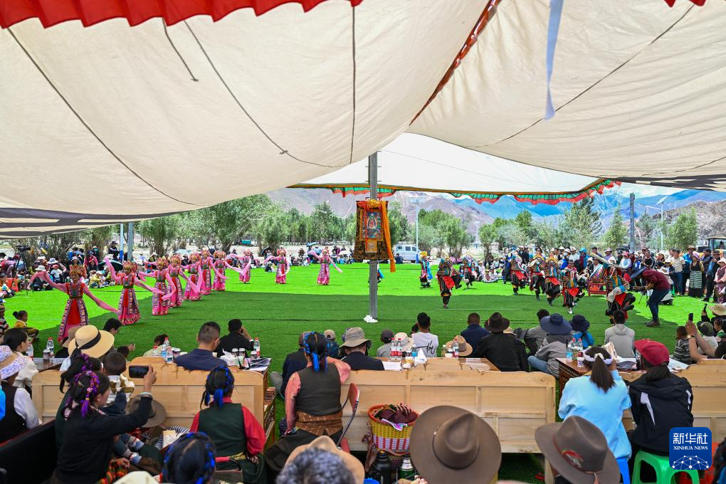 7月16日,群众在南木林县非遗公园内观看藏戏表演。
