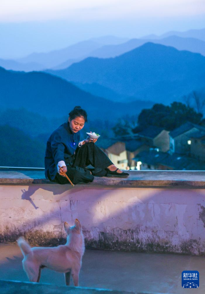 阳产村村民吃晚饭时与小狗互动(2023年11月29日摄)。