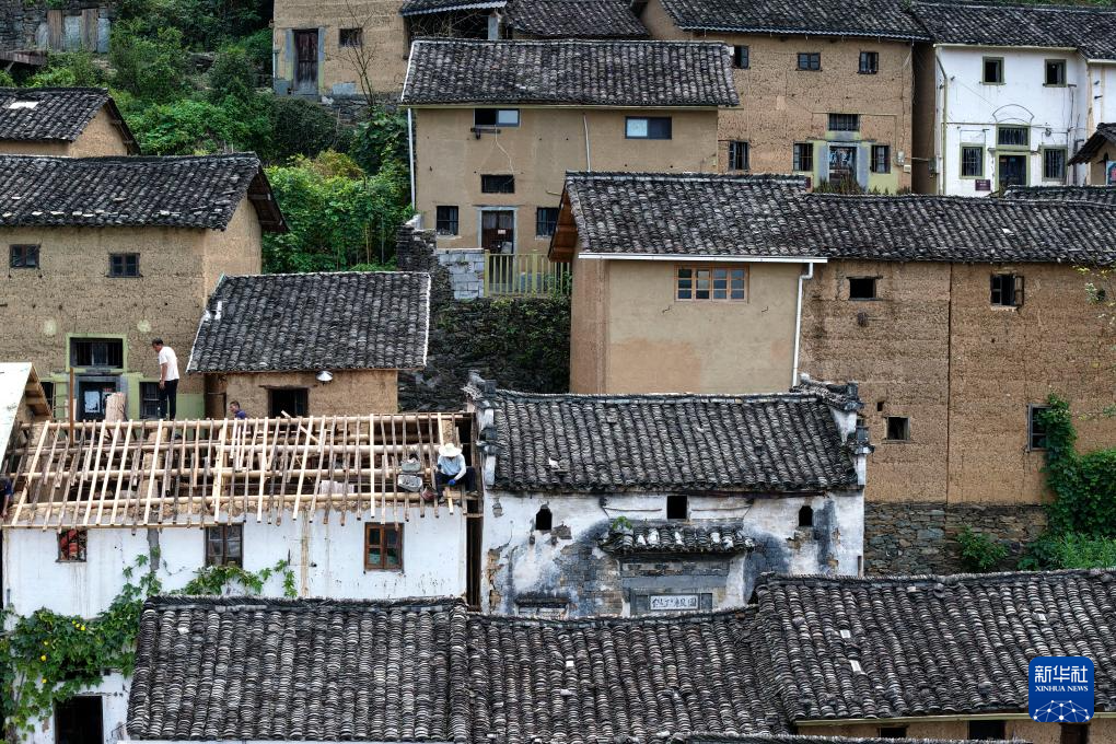 9月18日,阳产村村民在修缮房屋(无人机照片)。