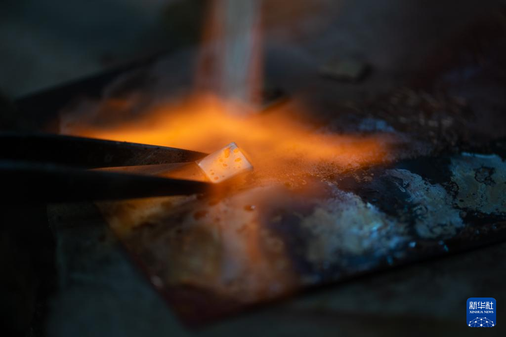 10月25日,在昆明乌铜走银传习馆,匠人将放置在乌铜片表面的银片融化,进行“走银”。