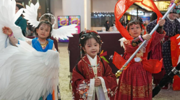 10月27日,在霍尔果斯首届国际文化艺术季上,我国变脸艺术演员邀请外国小朋友上台互动体验。