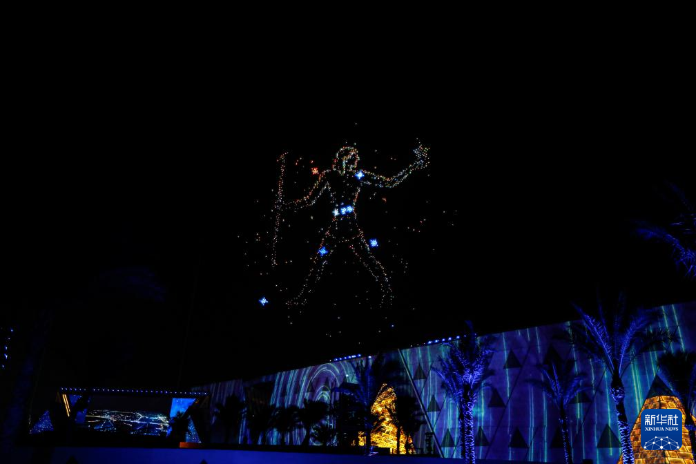 这是11月1日在埃及吉萨拍摄的开馆仪式上的无人机表演和灯光秀。