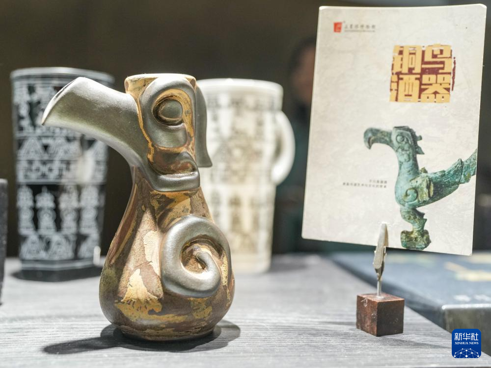 10月30日在四川省广汉市三星堆博物馆内的文创商店拍摄的文创产品铜鸟酒器。