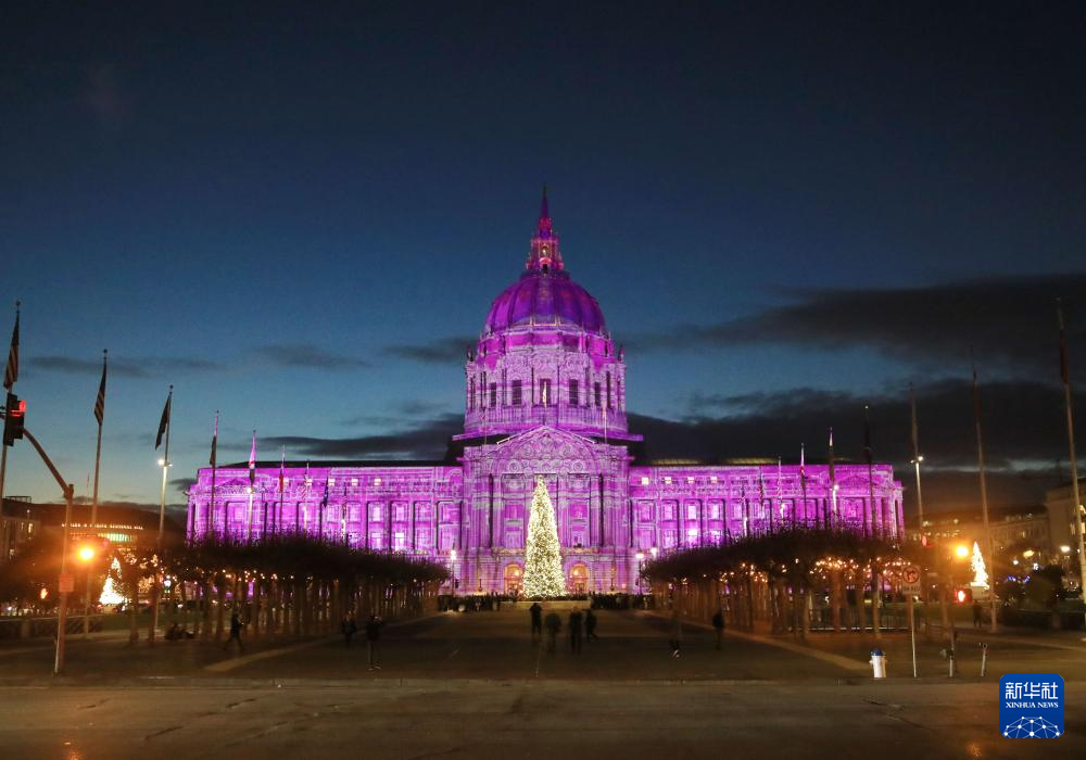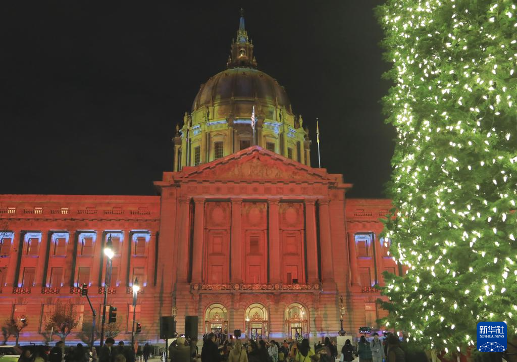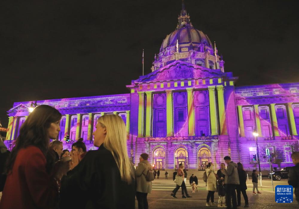 当晚,美国旧金山市政厅举办冬季灯光秀,吸引人们前来观赏。