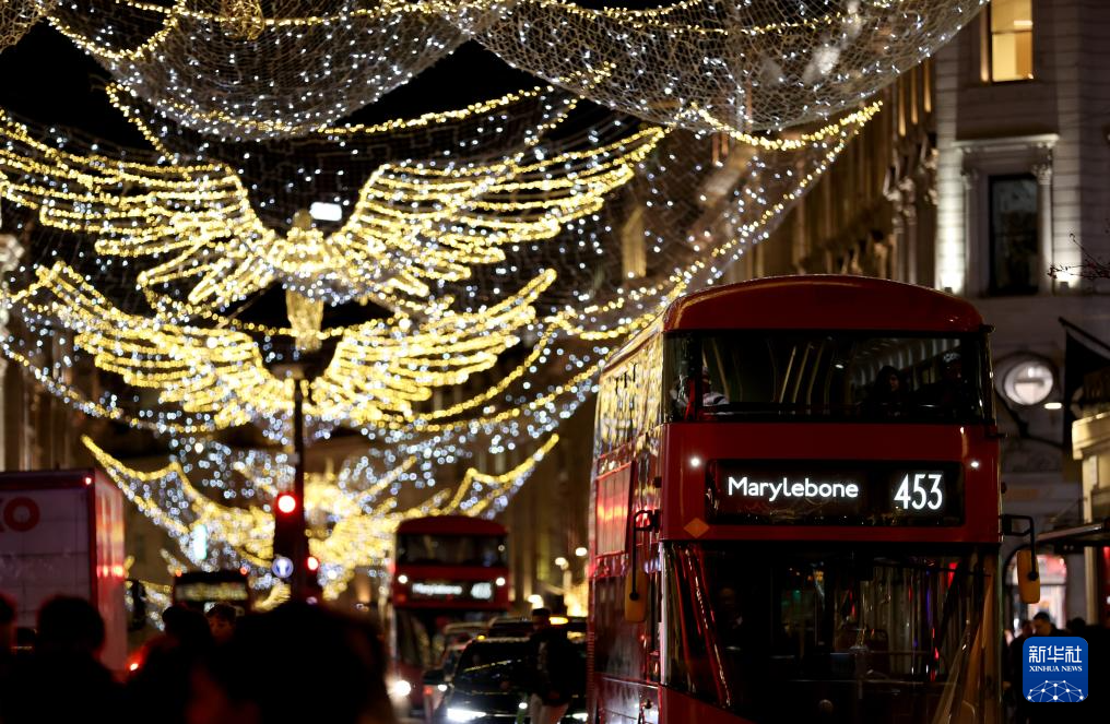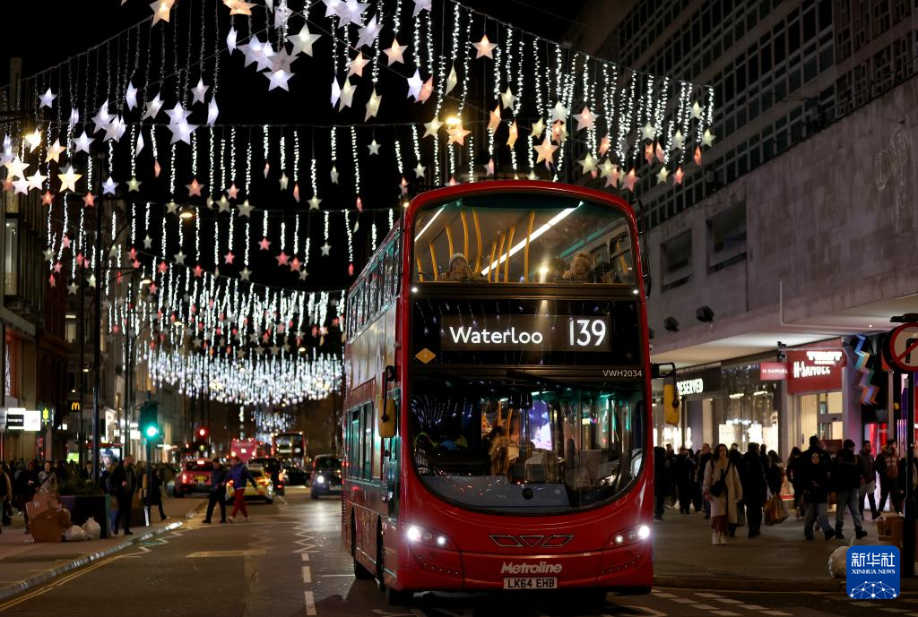 12月17日,在英国伦敦,一辆双层巴士驶过悬挂彩灯的街道。新华社记者 李颖 摄
