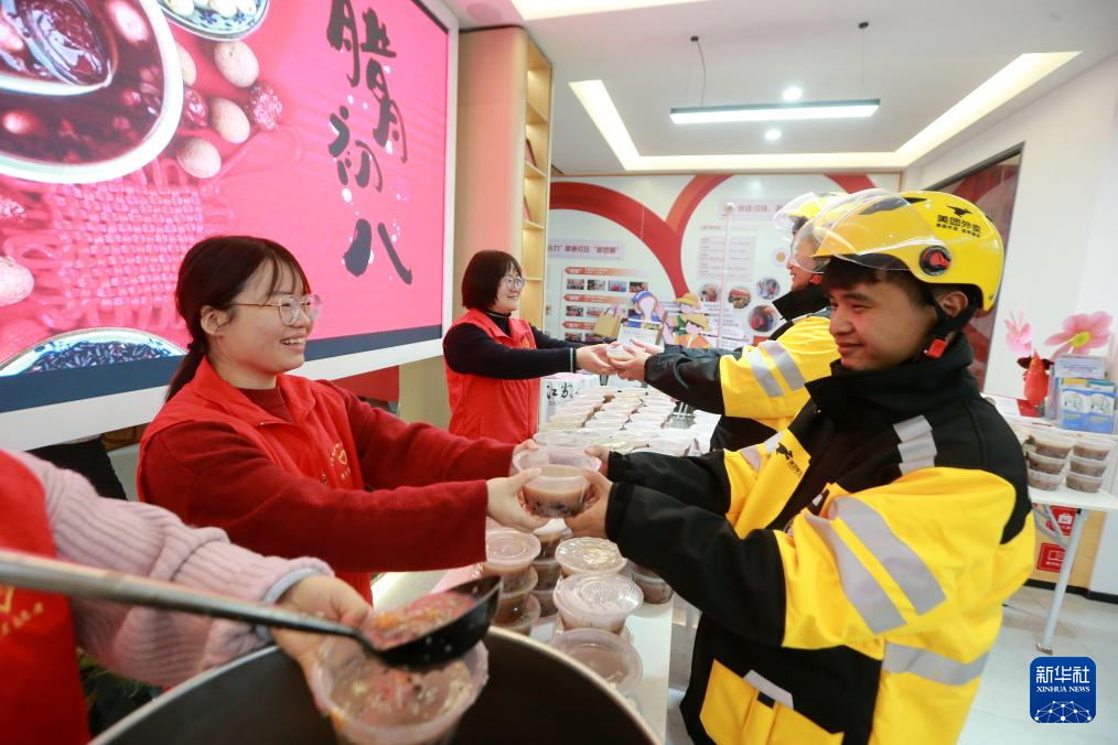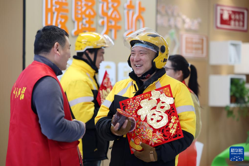 1月26日,在山东省临沂市郯城县郯城街道郯中社区“暖蜂驿站”,社区志愿者为外卖骑手送上腊八粥和“福”字。