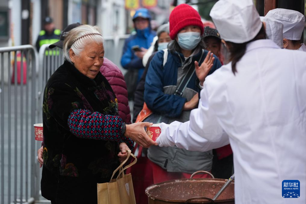 1月26日,市民在杭州河坊街方回春堂领取腊八粥。