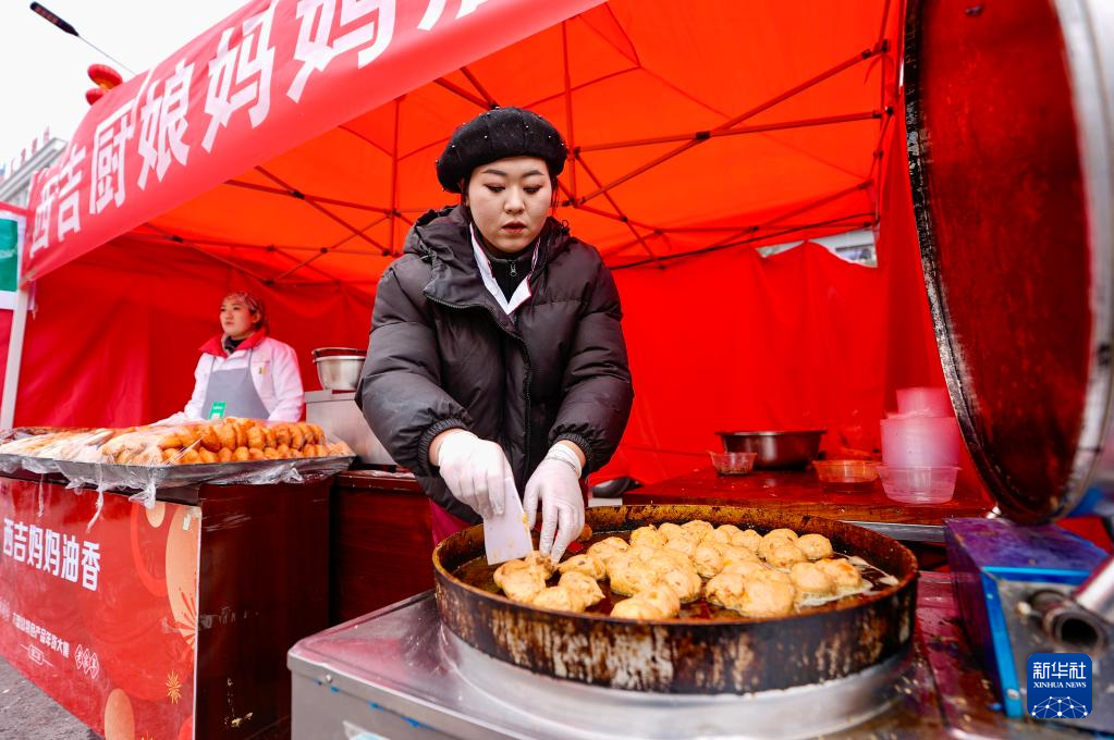 2月3日,商户在宁夏固原市西吉县年货大集上制作小吃。