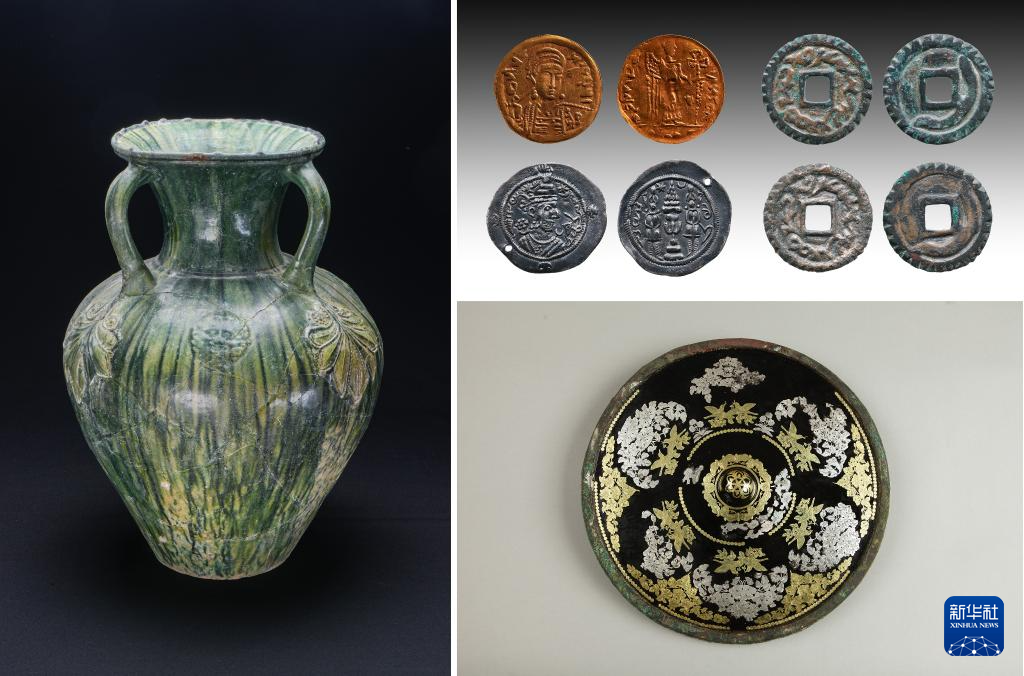 拼版照片:新疆吐鲁番市巴达木东晋唐时期墓地出土的部分文物(左:三耳绿釉罐,右上:拜占庭金币、萨珊银币、突骑施钱币,右下:金银平脱花鸟纹铜镜)(资料照片)。