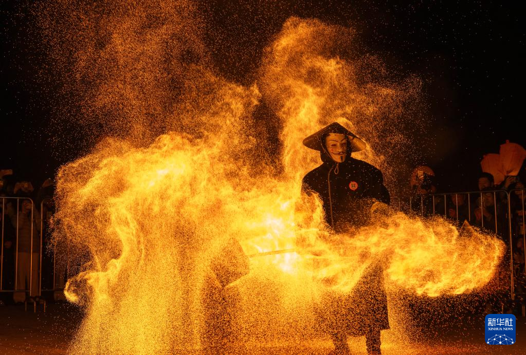 2月10日在重庆市磁器口古镇拍摄的火壶表演。