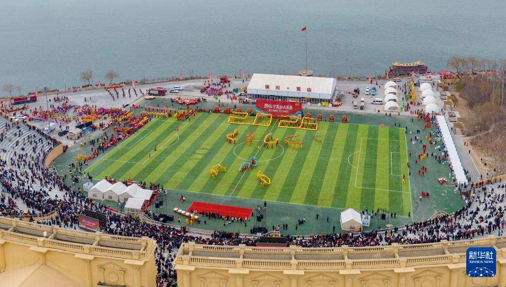 3月1日,在宁夏银川市览山公园,参赛社火队的演员在比赛中(无人机照片)。