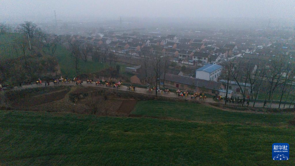 3月2日,陇县黄花峪村社火队在游演途中(无人机照片)。