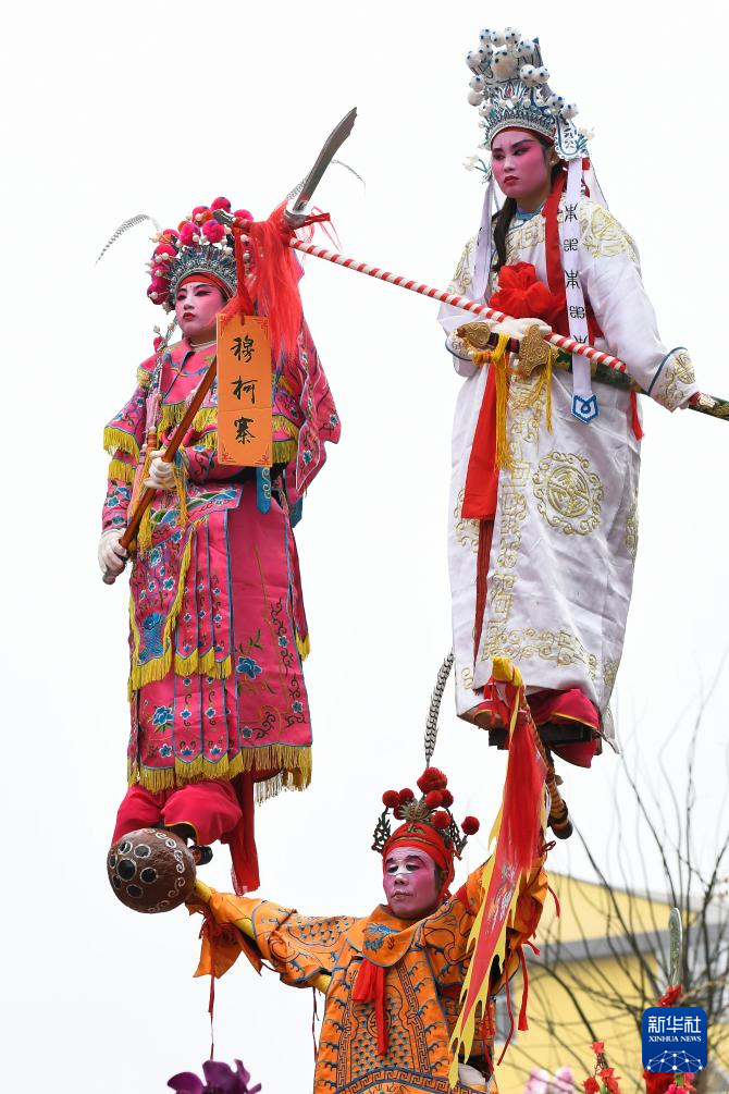 3月3日,演员在陇县元宵节社火巡游活动上表演高芯社火。