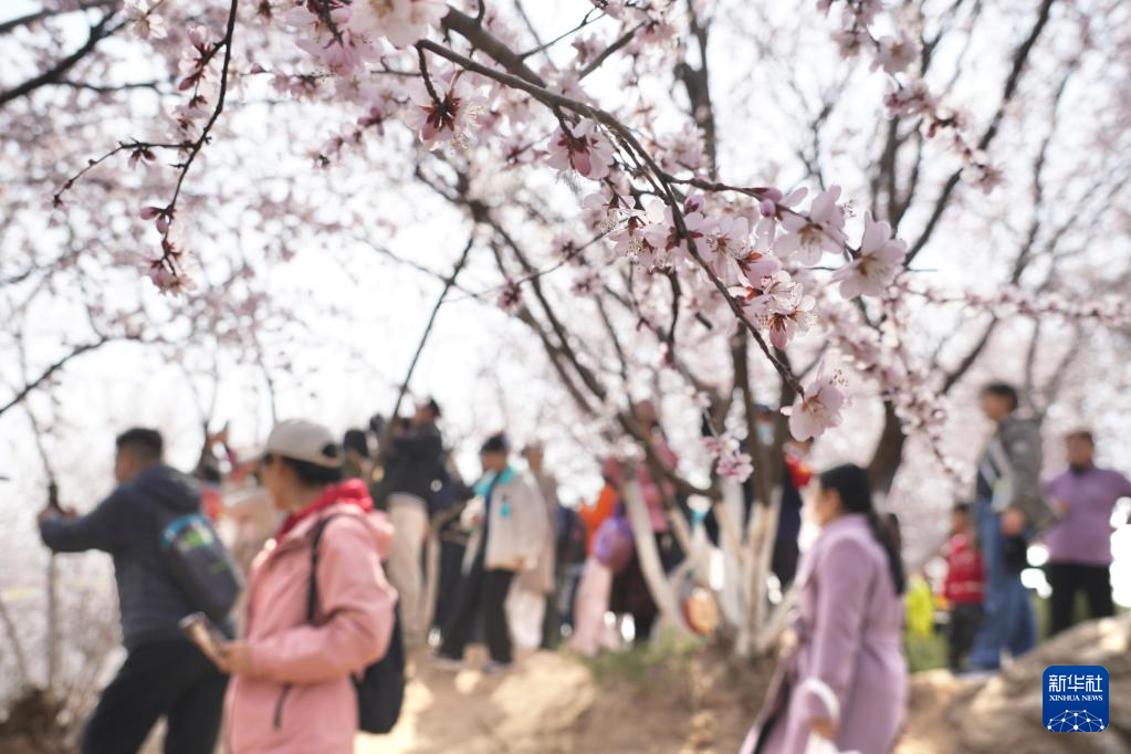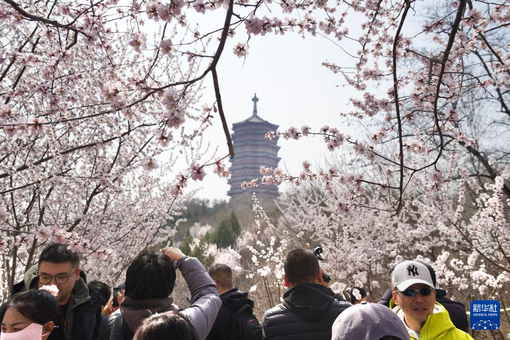 3月21日,游人在北京园博园赏花拍照。