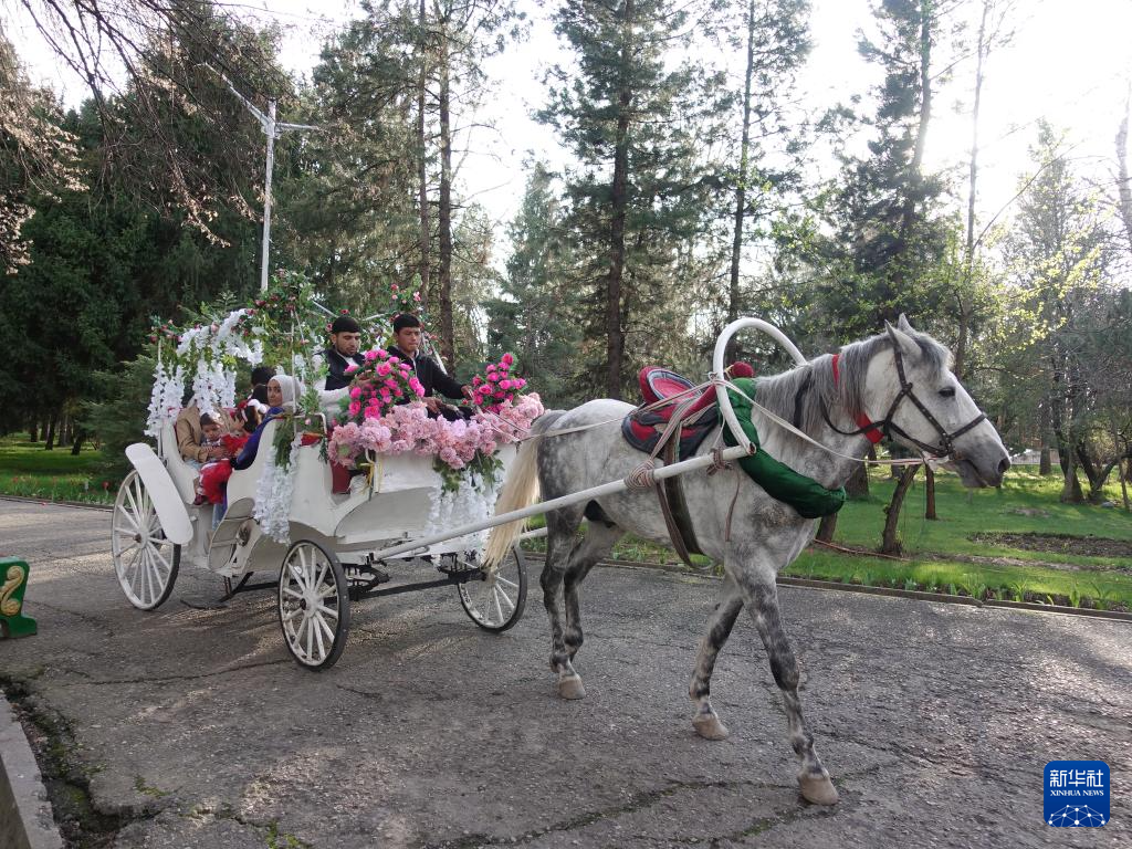 3月22日,在塔吉克斯坦首都杜尚别,人们乘坐马车参加文旅活动。