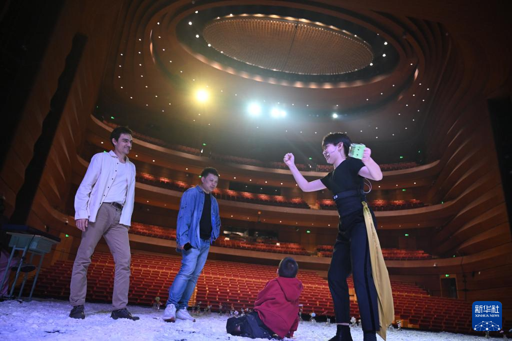 3月27日,演员马克·普拉斯、中方导演张瑞、演员金珍禾、李一辰(从左至右)在演出开始前交流。