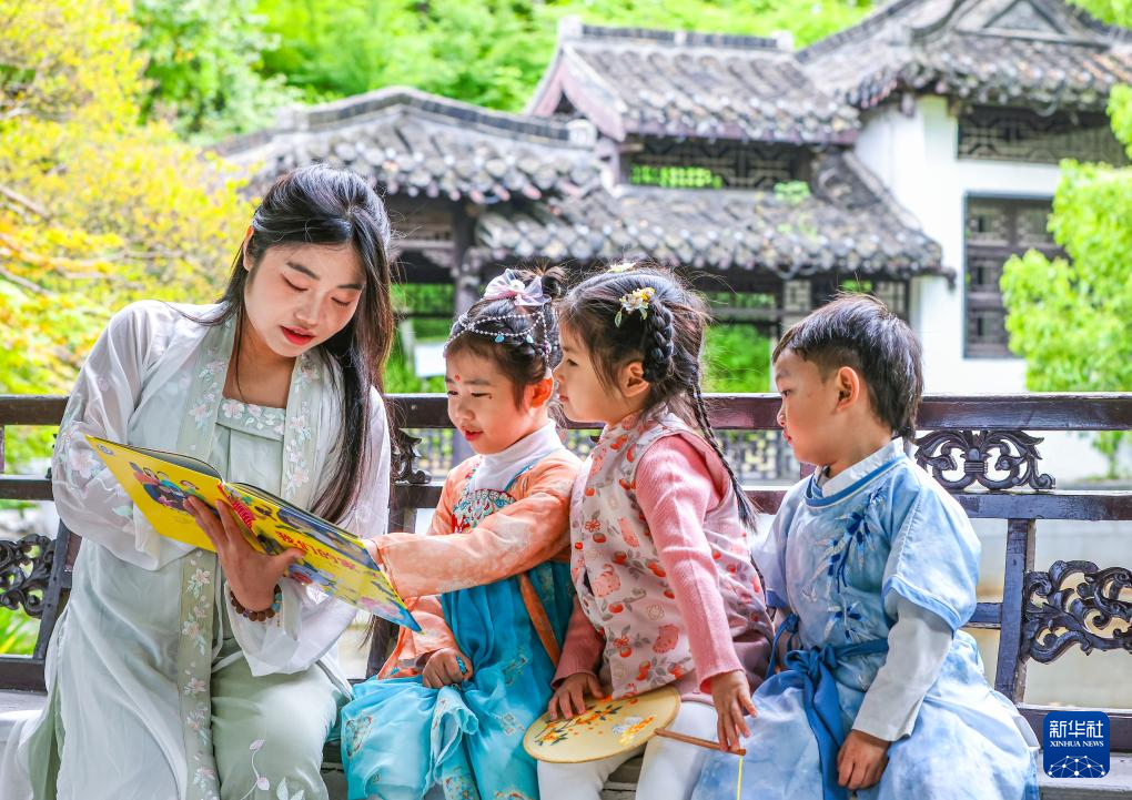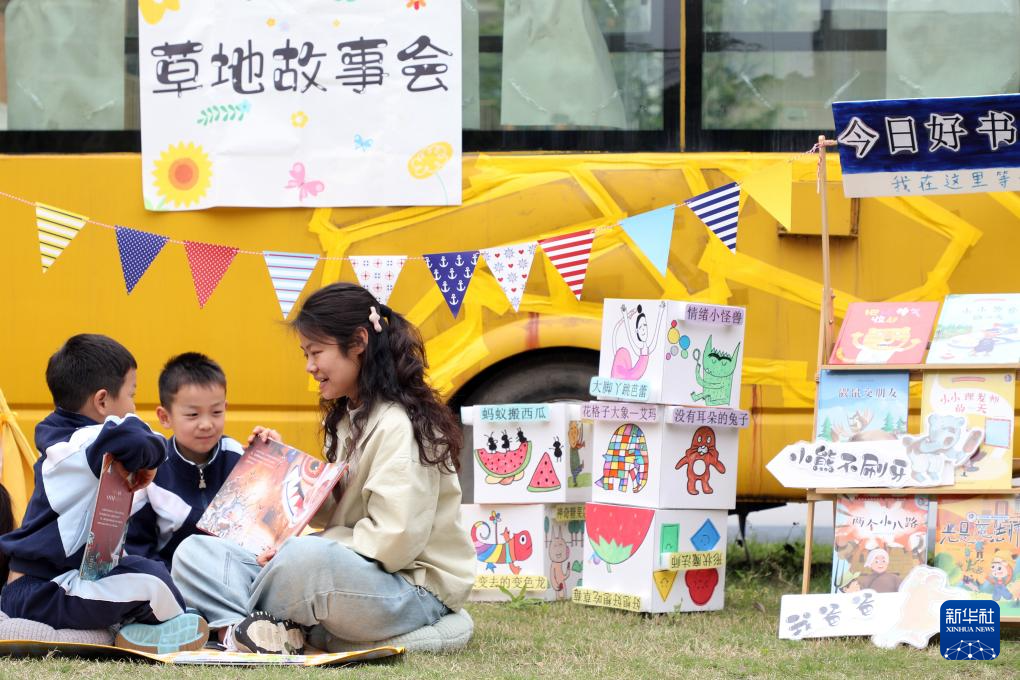 4月21日,在江苏省扬州市江都区仙女公园,社区志愿者和江都区实验幼儿园小朋友一起阅读书籍。