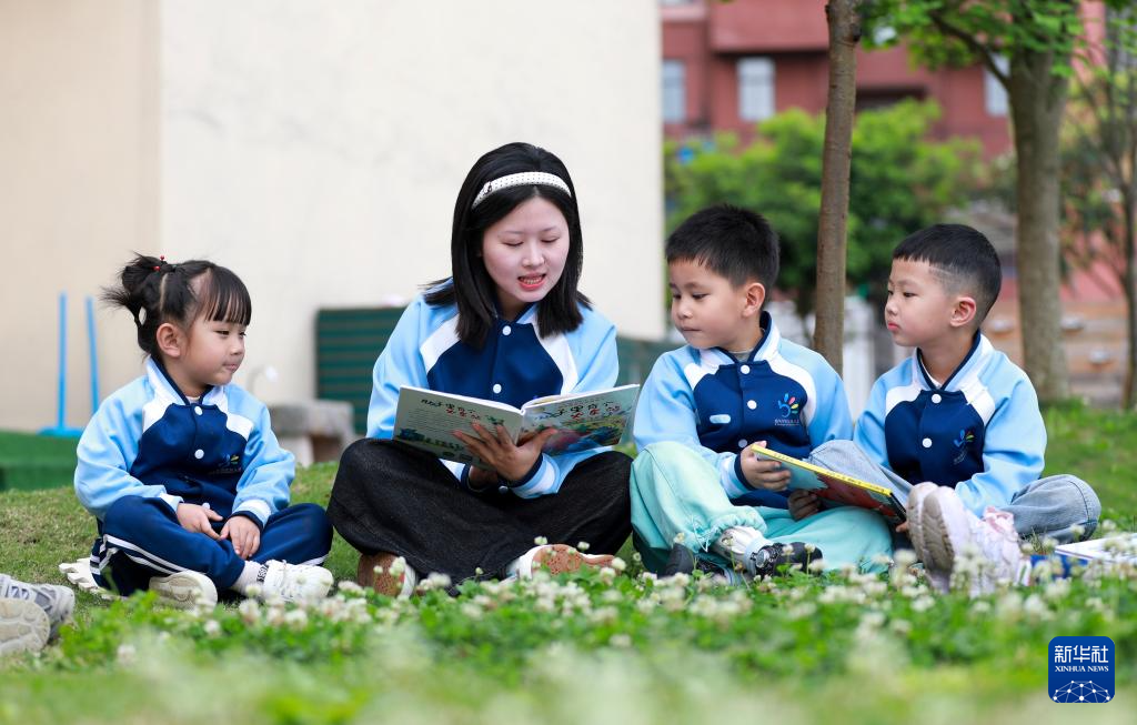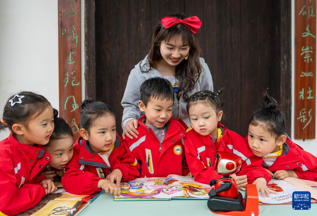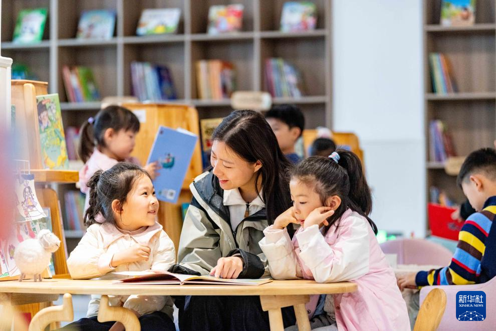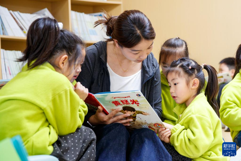 4月21日,在江苏省常州市钟楼区教育港荆川幼儿园,老师带着小朋友们阅读书籍。