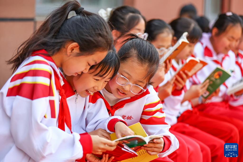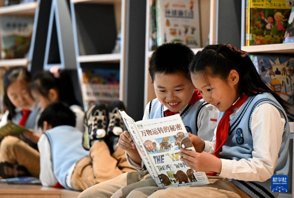 4月22日,小朋友在河北省石家庄市柏林庄学校图书馆阅读。