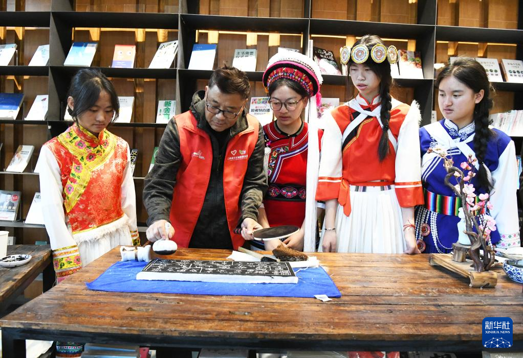 4月22日,在云南省丽江市玉龙县和风云上乡愁书院,读者在“世界读书日”活动上体验东巴文拓印。