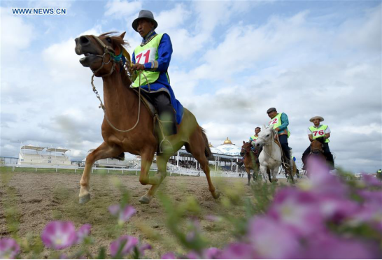 Contestants compete during horse racing in Darhan Muminggan United Banner, north China's Inner Mongolia Autonomous Region, July 22, 2017.(Xinhua/Ren Junchuan)