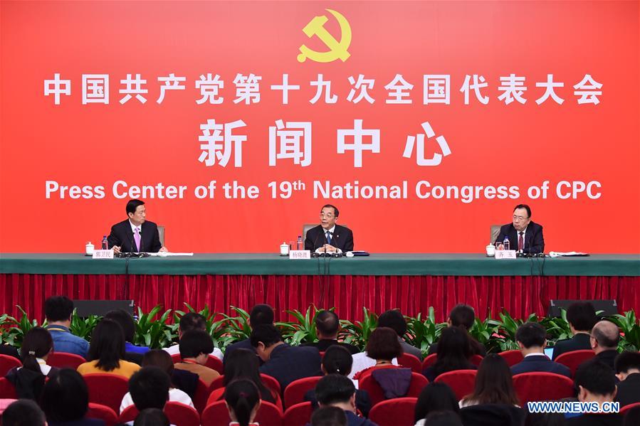 The press center of the 19th National Congress of the Communist Party of China (CPC) holds a press conference in Beijing, capital of China, Oct. 19, 2017. Yang Xiaodu (C), deputy secretary of the CPC Central Commission for Discipline Inspection, and Qi Yu (R), deputy head of the Organization Department of the CPC Central Committee, attended the press conference. (Xinhua/Li Xin)