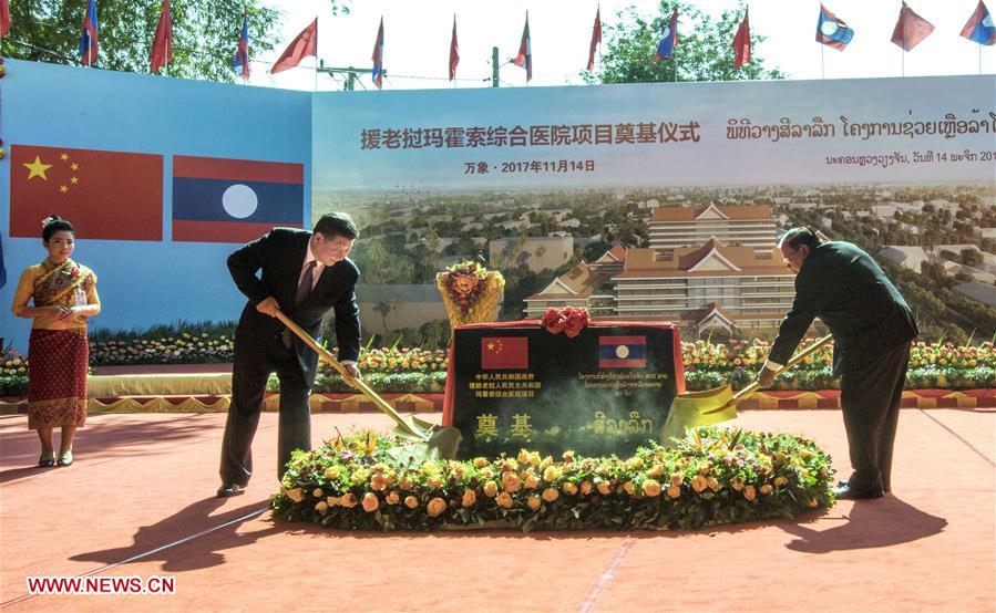 Chinese President Xi Jinping (C), also general secretary of the Communist Party of China Central Committee, and Lao President Bounnhang Vorachit, also general secretary of the Lao People's Revolutionary Party Central Committee, attend the foundation-laying ceremony for the China-built Mahosot Hospital in Vientiane, Laos, Nov. 14, 2017. (Xinhua/Li Tao)