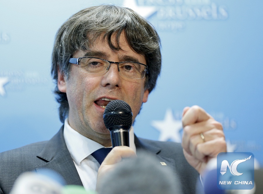 Ousted Catalan leader Carles Puigdemont addresses a press conference at the Press Club Europe in Brussels, Belgium, in Oct. 31, 2017. (Xinhua/Ye Pingfan)