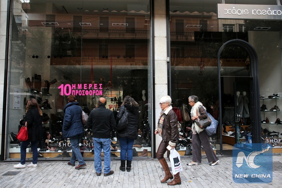 People walk past a shop in central Athens, Greece, on Dec. 20, 2017. Eight years into the debt crisis which has shaken Greek economy and dramatically changed Greeks' everyday life, positive financial indexes and retail turnover results indicate that Greece is recovering. Athens and international creditors are set to celebrate the exit from the bailout era next summer. (Xinhua/Marios Lolos)