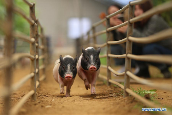 Piglets compete in a pig race held in Jiangjun agricultural garden of Jinpu New Area of Dalian, northeast China's Liaoning Province, Dec. 9, 2017. (Xinhua/Pu Feng)