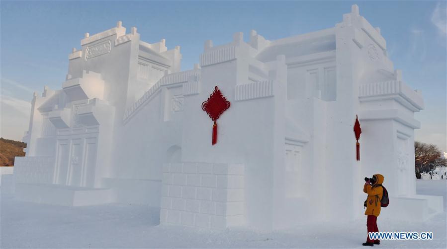 A visitor takes photos of the snow sculptures at Jingyuetan scenic spot in Changchun, northeast China's Jilin Province, Dec. 30, 2017. More than 100 snow sculptures will be displayed during the snow sculpture festival. (Xinhua/Zhang Nan)
