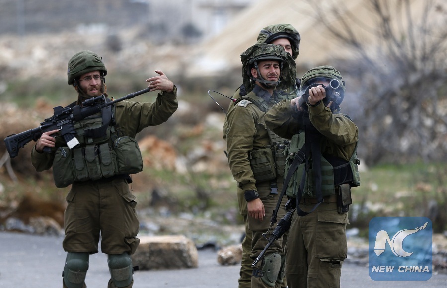 An Israeli soldier fires tear gas near one of the entrances to Israel's Offer prison in the West Bank village of Betunia as Palestinian protesters call for the release of prominent Palestinian campaigners on December 28, 2017. (AFP Photo)