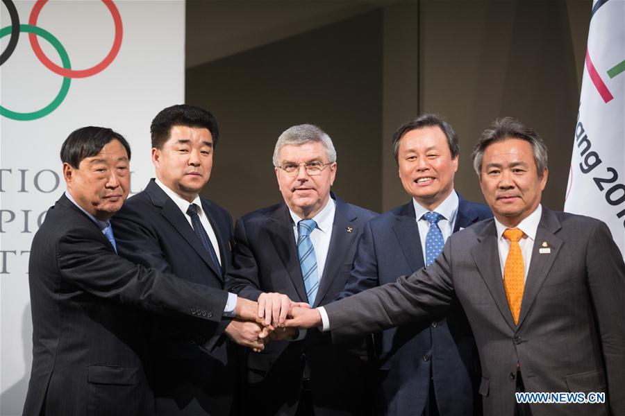 Lee Hee-beom, president of the PyeongChang Organizing Committee for the 2018 Olympic and Paralympic Winter Games (POCOG), the Democratic People's Republic of Korea (DPRK)'s Olympic Committee President and Sports Minister Kim Il Guk, International Olympic Committee (IOC) President Thomas Bach, South Korea's Sports Minister Do Jong-hwan and South Korea's President of the National Olympic Committee (NOC) Lee Kee-heung (From L to R) shake hands during a ceremony after a four-party meeting at the IOC headquarters in Lausanne, Switzerland, Jan. 20, 2018. (Xinhua/Xu Jinquan)