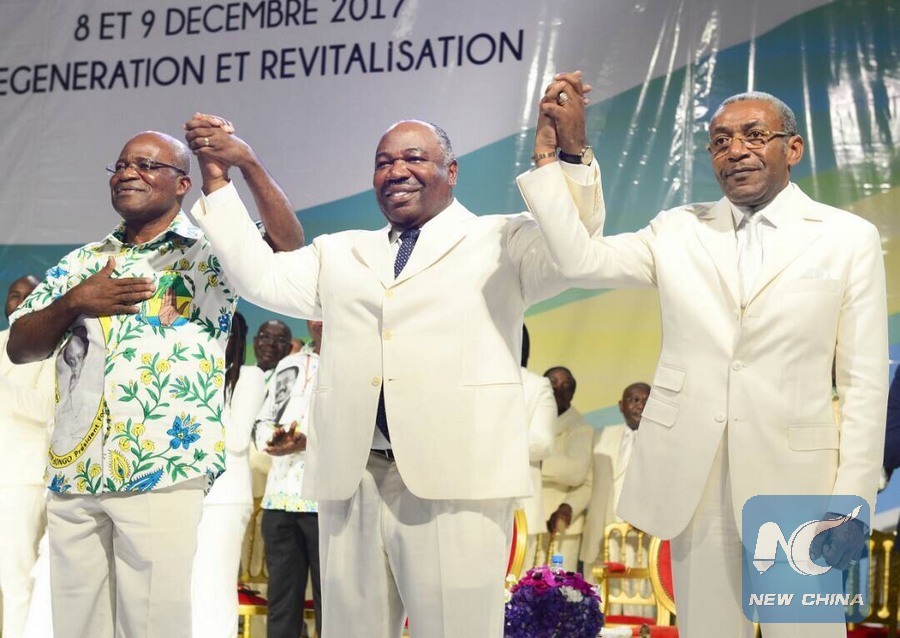 Photo shows President of Gabon Ali Bongo Ondimba (C) holding hands with Eric Dodo Bouguendza (R), Secretary General of Gabonese Democratic Party (PDG) and Faustin Boukoubi (L), former Secretary General of PDG. (Xinhua)