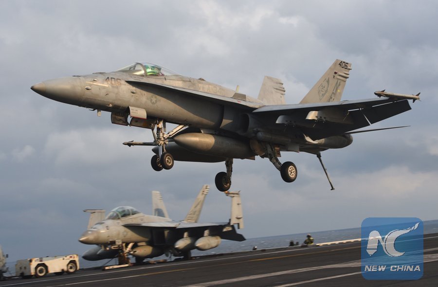 An F/A-18 fighter lands on the deck of the Nimitz-class aircraft carrier USS Carl Vinson during a South Korea-U.S. joint military exercise in seas east of the Korean Peninsula on March 14, 2017. (AFP Photo)
