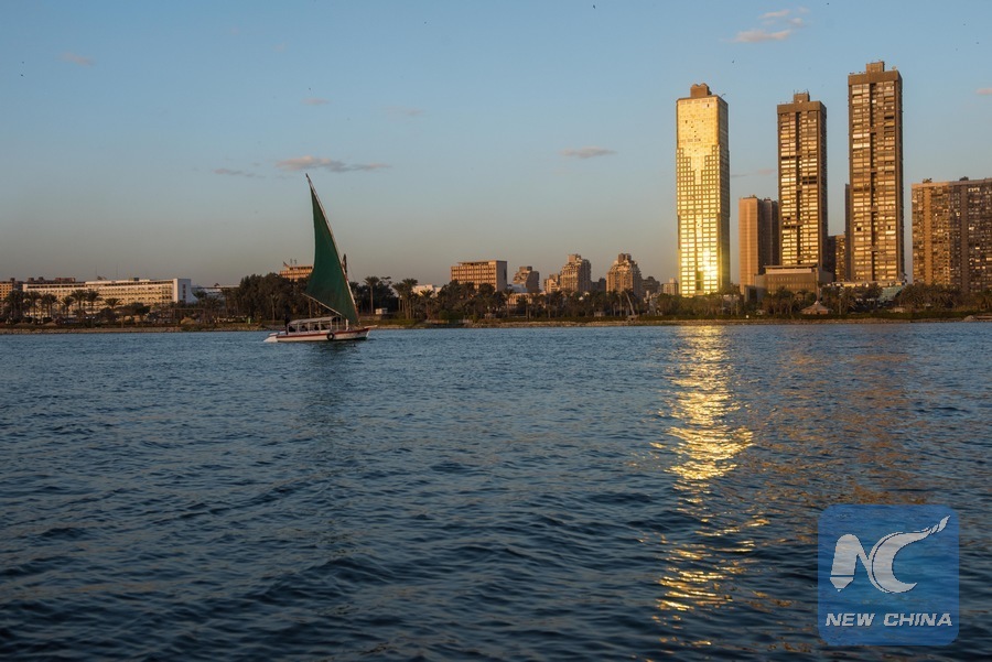 A sailing boat is seen amid sunset glow on the Nile River near Cairo, Egypt, Jan. 26, 2017.(Xinhua/Meng Tao)