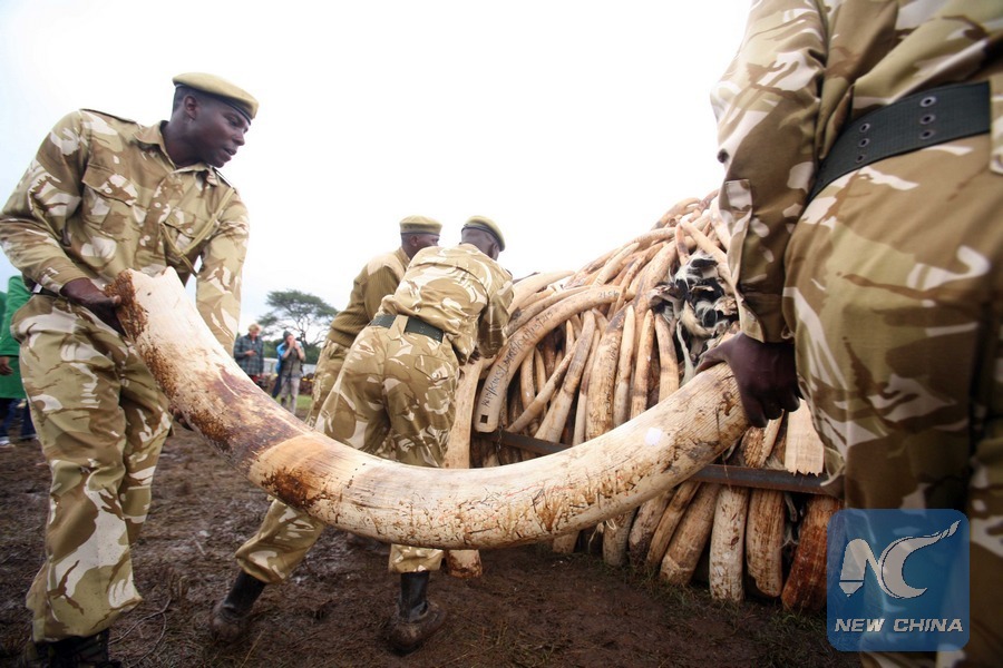 Staff members of Kenya Wildlife Service stack elephant tusks into pyres at the burning site of the Nairobi National Park in Nairobi, capital of Kenya, April 20, 2016. (Xinhua/John Okoyo)