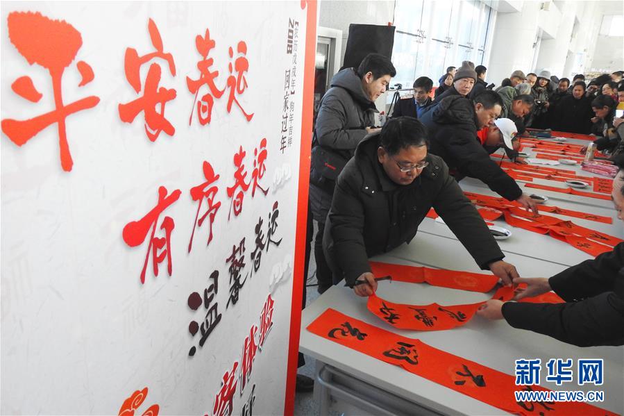Calligraphers volunteer to write Spring Festival couplets for passengers at Lianyungang East Railway Station, east China's Jiangsu Province, Feb. 1, 2018. (Xinhua/Geng Yuhe)