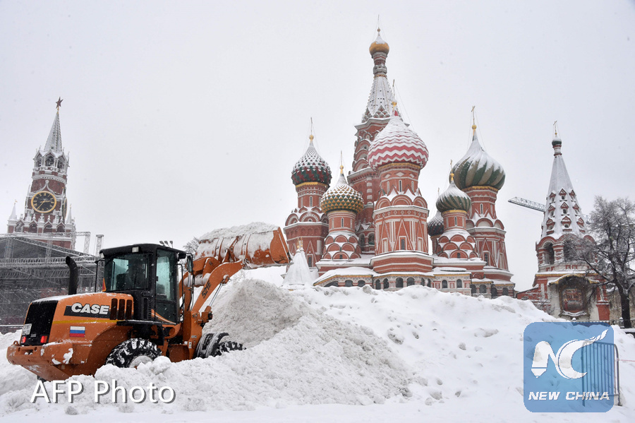A bulldozer shovels snow off Red Square as snow falls in Moscow on February 4, 2018. (AFP PHOTO)