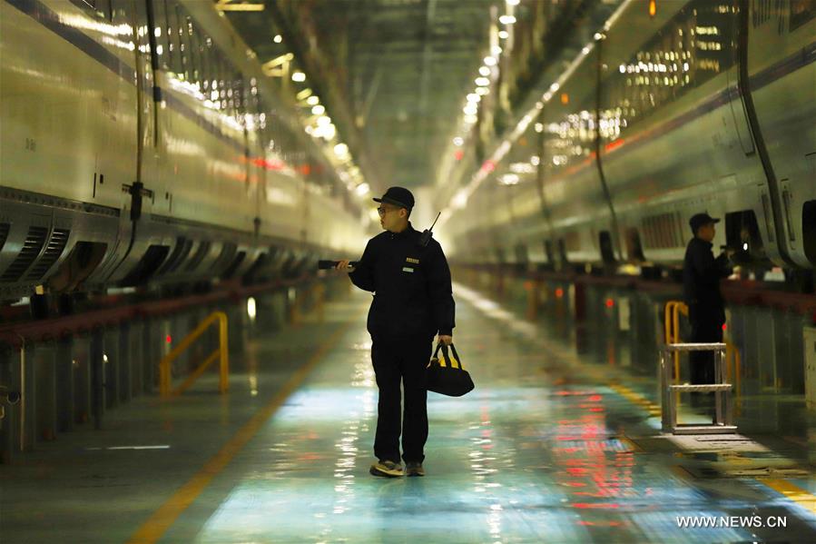 Workers check the bullet trains at a maintenance station in Guiyang, capital of southwest China's Guizhou Province, Jan. 31, 2018. Workers check the trains in order to guarantee travel safety during the Spring Festival travel rush between February 1 and March 12. (Xinhua/Wu Jibin)
