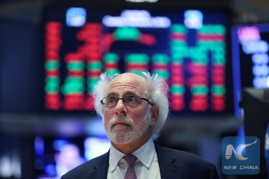 A trader works at the New York Stock Exchange in New York, the United States, Feb. 6, 2018. U.S. stocks closed higher after a volatile trading session on Tuesday. The Dow Jones Industrial Average added 567.02 points, or 2.33 percent, to 24,912.77. The S&P 500 increased 46.20 points, or 1.74 percent, to 2,695.14. The Nasdaq Composite Index was up 148.36 points, or 2.13 percent, to 7,115.88. (Xinhua/Wang Ying)
