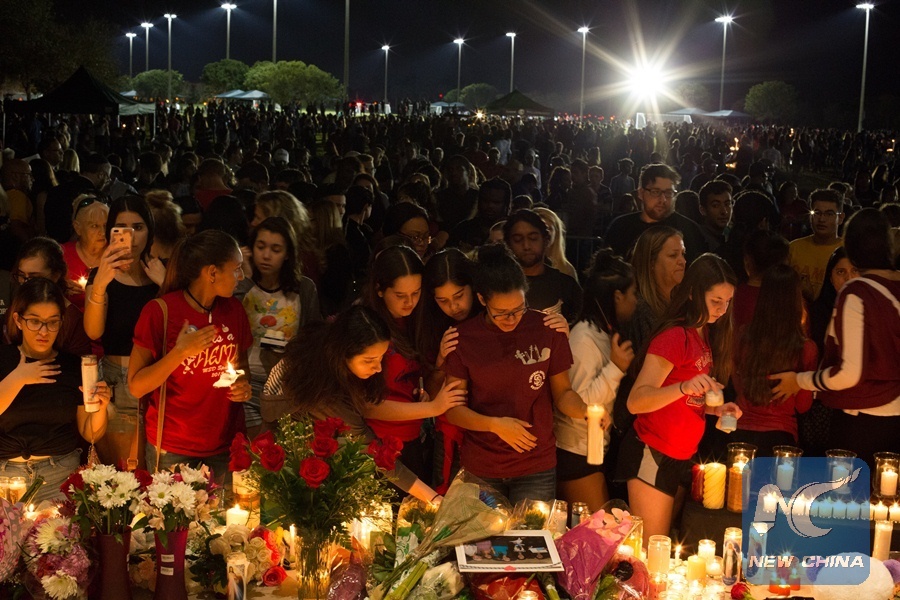 Thousands of the South Florida community gather at Pine Trails Park on Feb.15, 2018 to honor the 17 fallen victims of the recent Florida school shooting. (Xinhua/Monica McGivern)