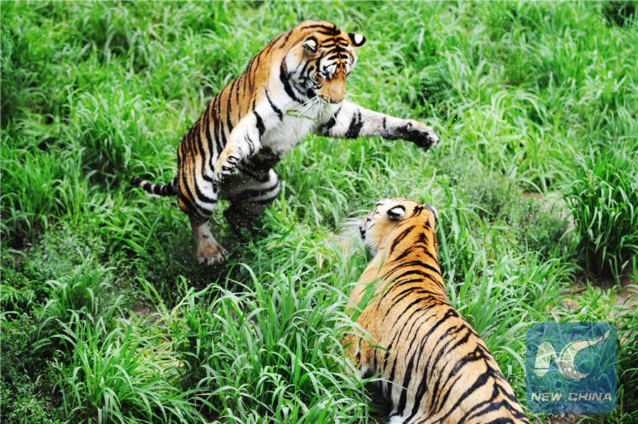 Siberian tigers play at the Siberian Tiger Park in Hengdaohezi Township of Hailin City, northeast China's Heilongjiang Province. (Xinhua/Wang Jianwei)