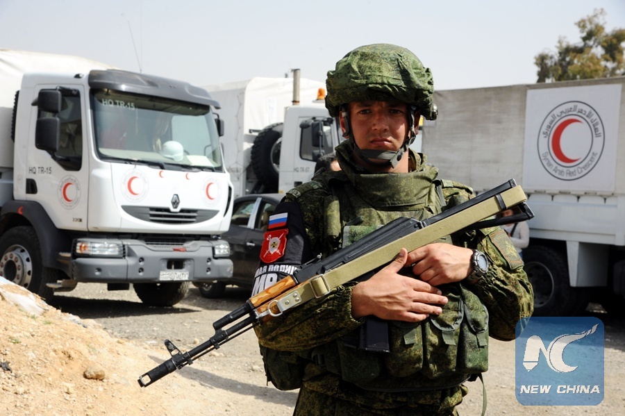 A Russian soldier stands guard as truckloads of aid cross the Wafidin area, northeast of Damascus, toward the rebel-held Douma district in the Eastern Ghouta countryside on March 5, 2018. As many as 46 truckloads of relief aid entered the rebel-held Douma district in the Eastern Ghouta countryside east of the Syrian capital Damascus on Monday. (Xinhua/Ammar Safarjalani)