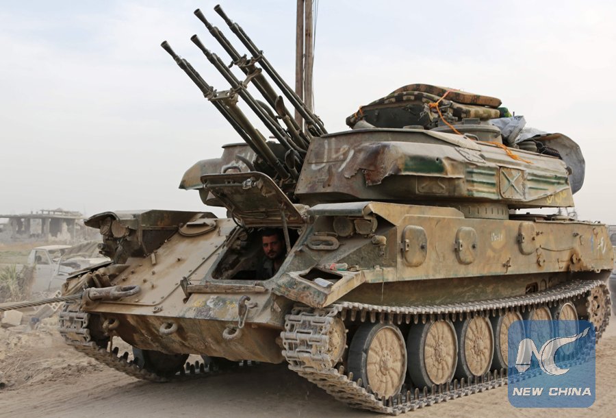 A member of the Syrian government forces looks out from a heavily armed military vehicle in al-Shifoniya as they advance in the rebel-held Eastern Ghouta area on March 4, 2018. (Xinhua/AFP)