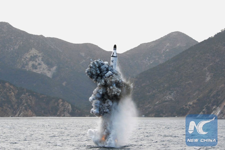Photo provided by Korean Central News Agency (KCNA) on April 24, 2016 shows a scene of an underwater test-fire of submarine ballistic missile in the Democratic People's Republic of Korea (DPRK). (Xinhua/KCNA)